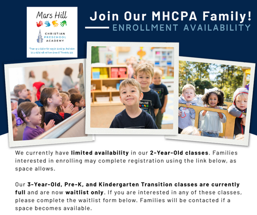Mars Hill Christian Preschool Academy has been a ministry of the church since 2007. Our goal is to introduce children to the things of God in a safe and caring environment. We create a nurturing environment rooted in faith, guiding our students' hearts and minds. Our commitment is evident in the daily activities, teachings, and interactions with our students. Inspired by our belief in the Bible, we share love, compassion, and understanding. Education for us goes beyond academics; it involves nurturing character, Christian principles, and a sense of purpose.